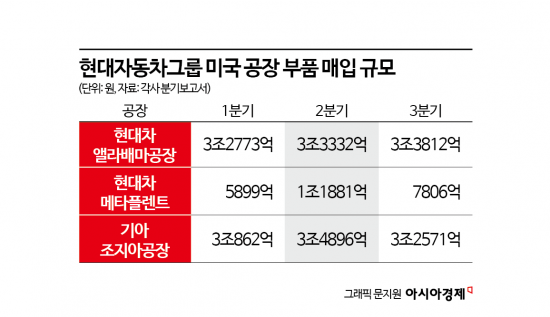 20일 현대차·기아 3분기 보고서를 보면 현대차 앨라배마공장의 부품 매입액은 올 들어 3분기까지 9조9917억원에 달했다.