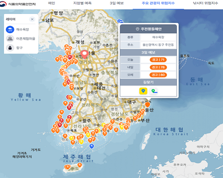 해수욕장 비브리오 예측시스템. 식약처 제공 비브리오 예측시스템은 비브리오 패혈증균 발육에 영향을 미치는 수온, 해수 교환율, 과거 균 검출이력 정보의 상관관계 분석을 통해 패혈증균 발생 가능성을 예측하는 시스템이다. 식약처는 "여행객이 해수욕장 등을 방문할 때는 비브리오균으로 인한 피해가 발생하지 않도록 사전에 비브리오 예측시스템을 확인해달라"고 당부했다.