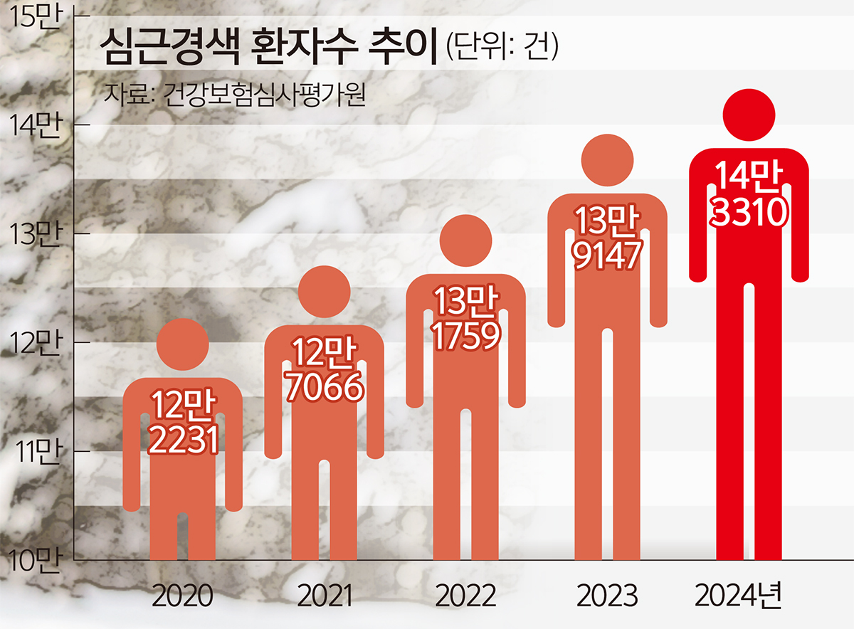 ◆추운 겨울 가슴 통증 땐 119 7일 건강보험심사평가원에 따르면 2020년 12만2200여명이던 심근경색 환자는 지난해 14만3300여명으로, 5년 새 약 17% 증가했다. 고령화와 함께 고혈압·당뇨병·이상지질혈증, 서구화된 식습관과 운동 부족이 복합적으로 작용한 결과로 분석된다.