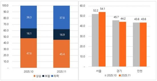 수도권(서울·경기·인천)의 상승거래 비중은 45.4%로, 10월(47.6%) 대비 낮아졌다. 보합거래 비중은 전월 대비 소폭 늘었고, 하락거래 비중도 함께 확대되면서 매수세 강도가 약화됐다.