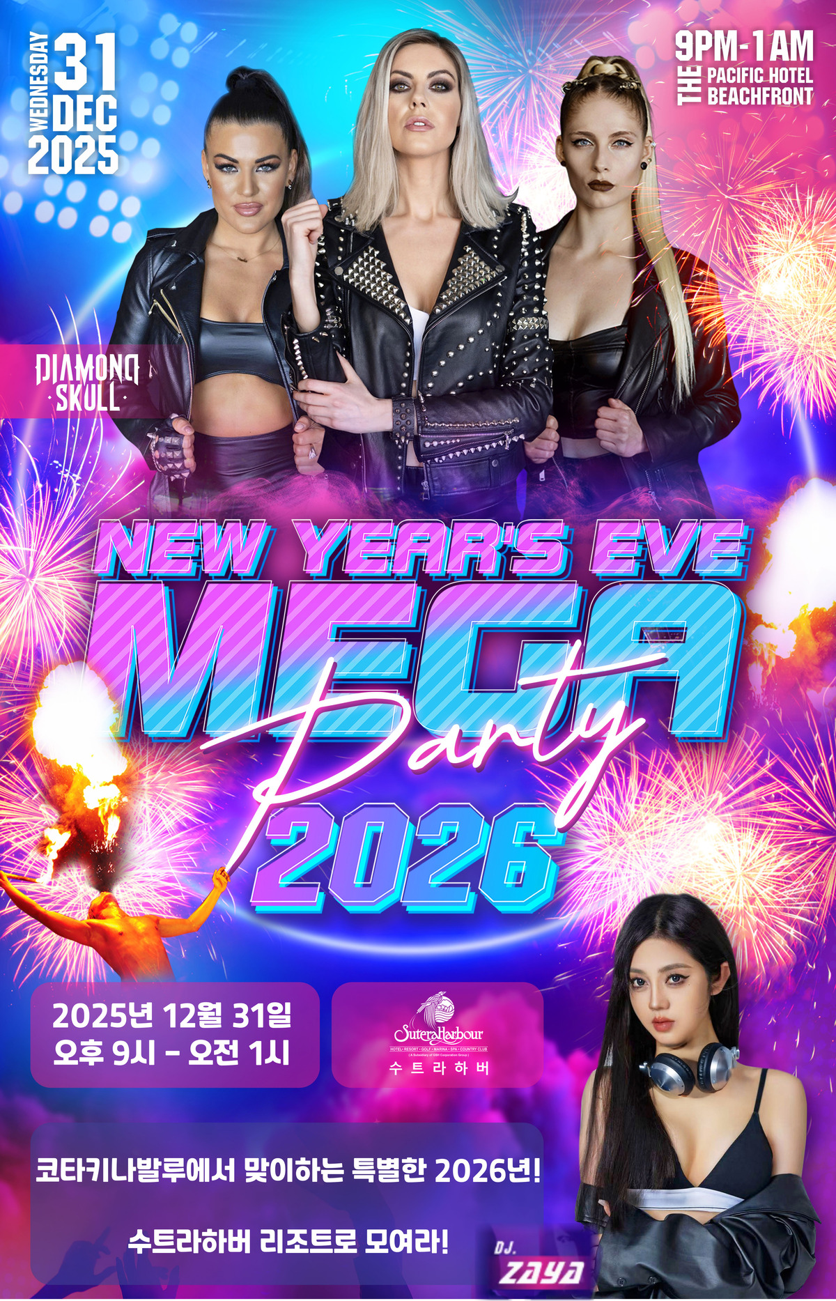 이번 메가파티는 수트라하버 리조트 퍼시픽 호텔과 마리나 클럽 일대에서 열린다. ‘세계 3대 석양’으로 꼽히는 코타키나발루 선셋 타임부터 본격적인 파티가 시작된다. 강렬한 무대 퍼포먼스로 알려진 다이아몬드 스컬(Diamond Skull)과 감각적인 EDM 셋을 선보이는 DJ 자야(DJ Zaya) 등이 무대에 오른다. 자정 카운트다운 직후에는 대형 불꽃 쇼와 라이브 엔터테인먼트가 펼쳐져 새해의 시작을 장식할 예정이다.