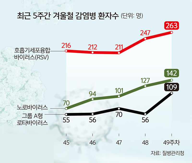 올해 49주차 전국 221개 병원급 표본감시 의료기관에 입원한 호흡기세포융합바이러스(RSV) 환자는 263명으로 최근 3주 동안 증가세(211명→247명→263명)를 이어갔다. 이 가운데 0~6세 영유아 환자는 190명(72.2%)으로, 유행의 중심에 있는 것으로 나타났다.