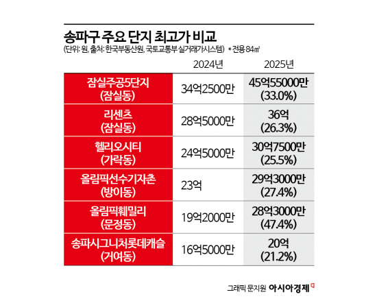헬리오시티(가락동), 올림픽선수기자촌(방이동), 올림픽훼밀리(문정동) 등 각 동의 대표 단지들 역시 20~40%대 상승률을 기록했다. 여기에 거여·마천 등 상대적으로 저평가됐던 외곽 지역까지 '키 맞추기'가 동시에 진행되며 구 전체 상승률을 끌어올렸다는 분석이다.