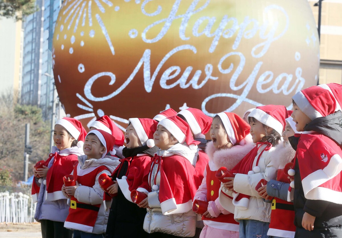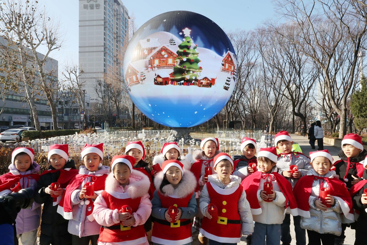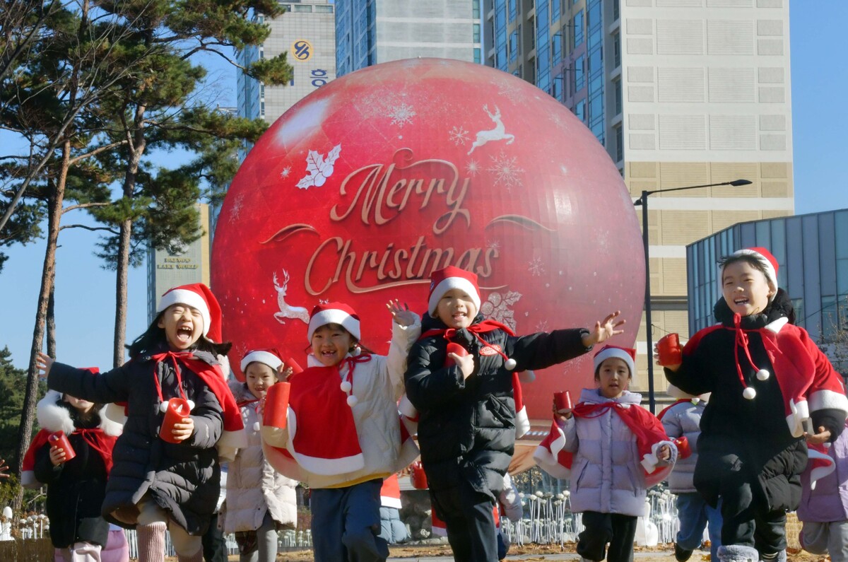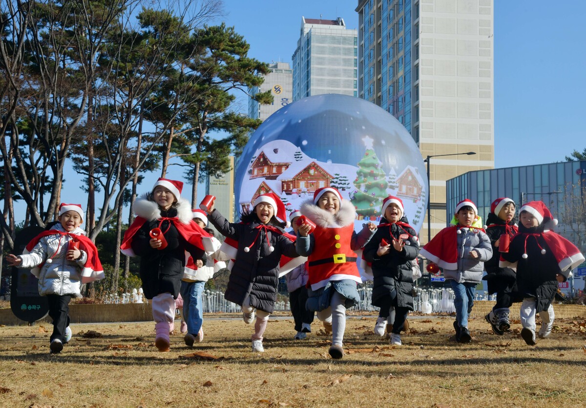 산타 복장을 차려입은 송파구청 어린이집 원생들이 18일 서울 송파구 석촌호수 더 스피어 앞에서 뛰어 놀고 있다. 송파구는 연말연시를 맞아 더 스피어를 통해 크리스마스와 새해를 주제로 한 미디어아트를 상영한다. 미디어아트의 주요 공간인 ‘더 스피어(The Sphere)’는 올봄 석촌호수 서호에 조성된 지름 7m 규모의 구(球) 형태 미디어아트 시설로, 태양계와 명화 등 총 27종의 다채로운 콘텐츠를 상영하고 있다.