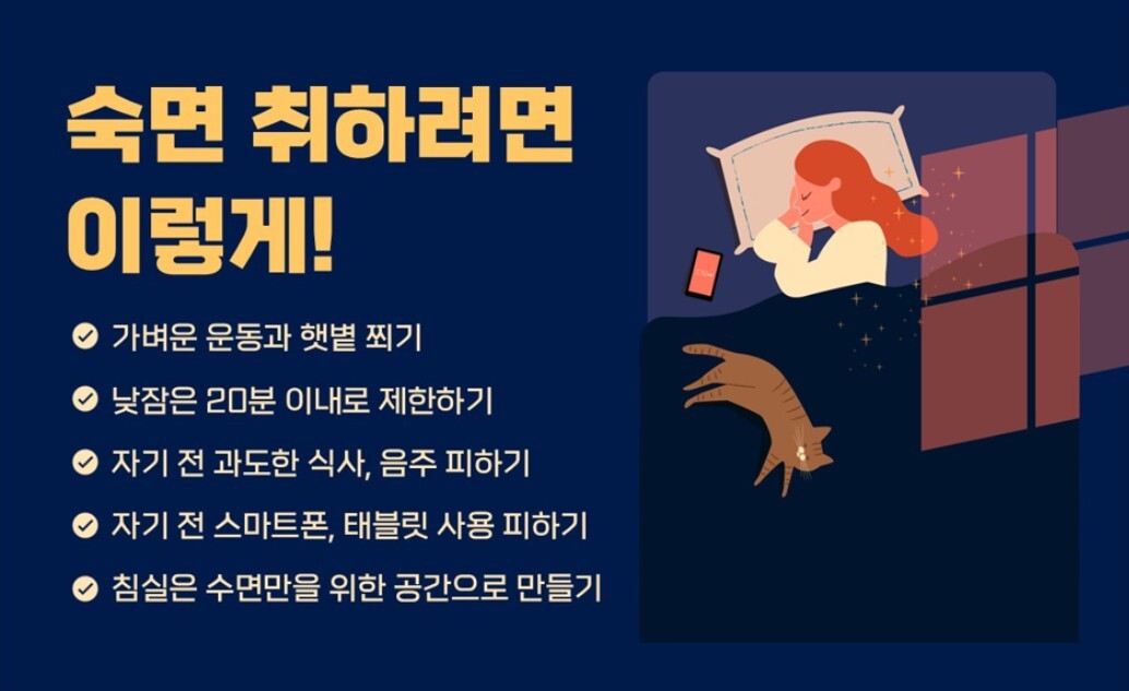 평소 정상적인 수면을 취할 수 있는 생활습관을 갖는 게 중요하다고 전문가들은 판단한다. 낮에는 햇볕을 충분히 쐬도록 해 생체시계가 정상적으로 작동하고, 잠을 깨우는 호르몬인 세로토닌 분비를 촉진시킨다. 규칙적인 운동도 추천한다. 잠들기 3시간 이전에 강도 높은 운동은 오히려 교감신경을 자극해 수면을 방해하므로 피하자. 잠들기 2시간 전 스마트폰을 멀리한다. 전자기기에서 나오는 블루라이트는 숙면을 돕는 멜라토닌 분비를 억제시키기 때문이다. 따뜻한 물로 샤워하는 등 몸과 마음을 편안하게 만든다.