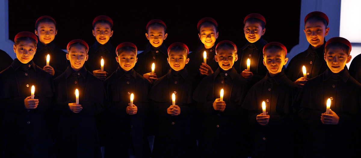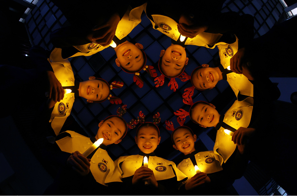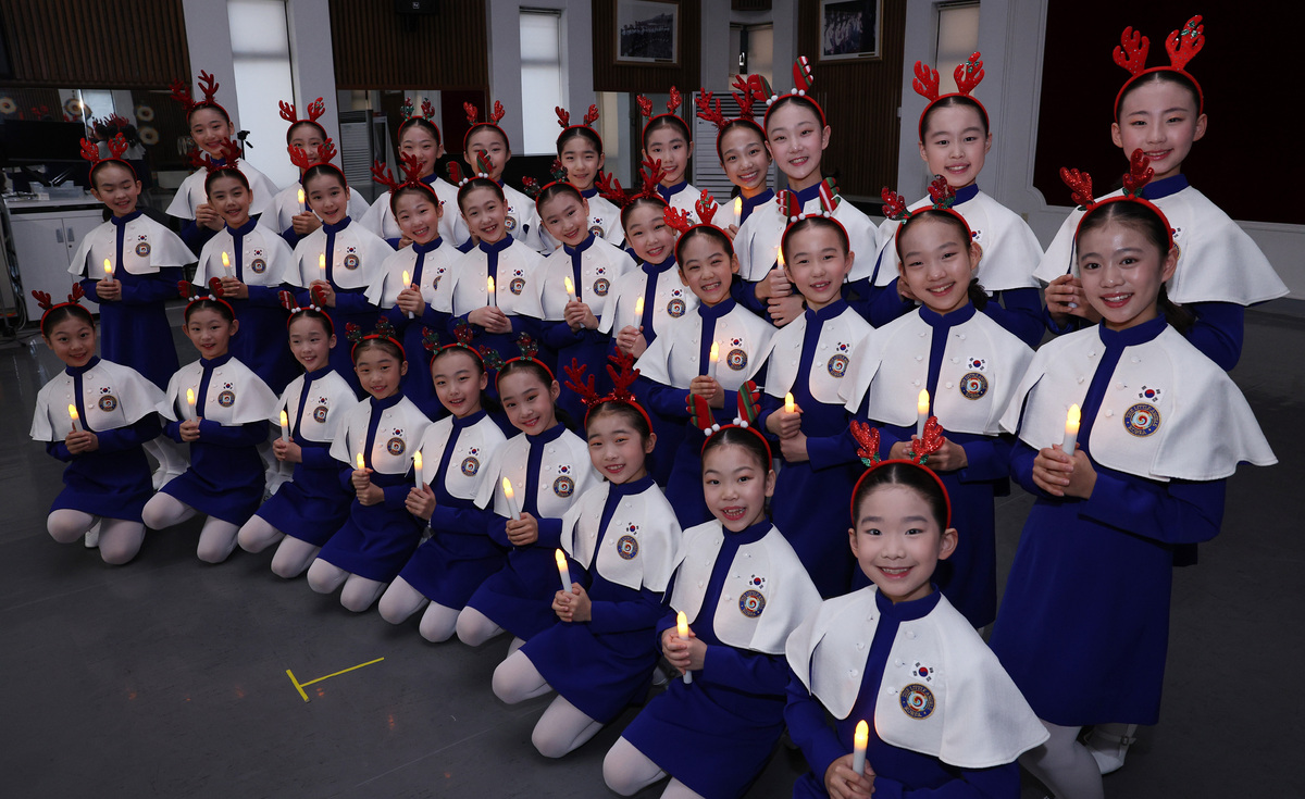 성탄절을 하루 앞둔 24일 서울 광진구 리틀엔젤스 연습실에서 루돌프 머리띠를 한 리틀엔젤스 단원들이 촛불 모양의 전구를 켜 든 채 이웃사랑의 온정이 담긴 희망의 메시지가 온 세상에 가득 퍼지길 기원하고 있다.
