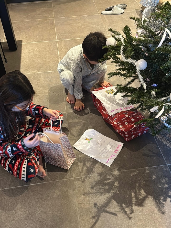 또한, 크리스마스 선물 꾸러미 앞에서 설렘을 감추지 못하는 남매의 뒷모습은 여느 평범한 가정과 다를 바 없는 따뜻한 분위기를 자아낸다.