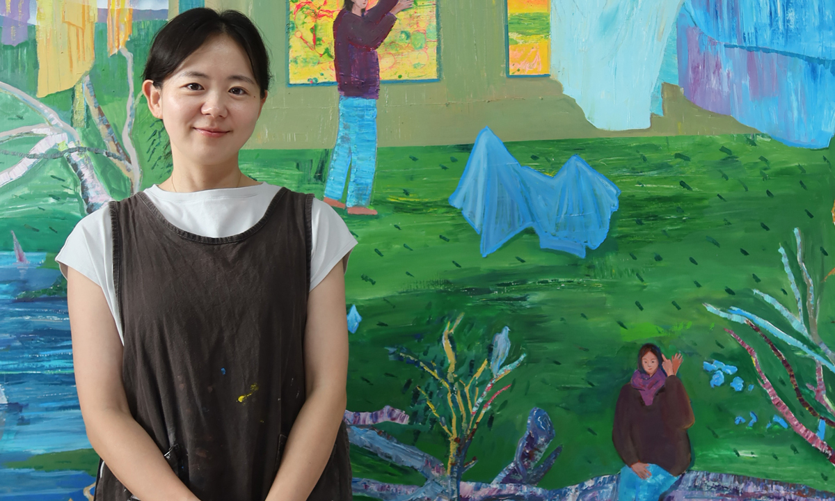 ◆숲 얼굴 바위 (259.1×193.9㎝) 시각예술가 김은정은 판화를 전공하고 독립출판, 편집, 북디자인을 병행하며 텍스트와 이미지의 관계를 지속적으로 탐색해 왔다. 언어로 완전히 포착될 수 없는 무언가를 향해 내밀어지는 말과 그림 사이에서, 작가는 쉽게 정의되지 않는 이야기와 감정, 현실과 상상이 느슨하게 뒤섞인 장면을 그려낸다. 그렇게 만들어진 화면은 하나의 의미나 상태로 고정되기보다 어느 한쪽으로 귀속되지 않은 채 중간 지점에 머문다. ‘숲 얼굴 바위’에는 작가가 오랜 시간 천착해 온 ‘간극’과 ‘중간 상태’에 대한 관심이 담겨 있다. 화면의 반 이상을 차지하는 눈은 물이 눈과 얼음이 되었다가 수증기로 흩어지는 변화의 과정을 은유한다. 눈 덮인 언덕 위에 우두커니 서 있는 여성상은 바로 그 변화의 경계에 위치한다. 사라지지 않고 잔존하는 기억, 혹은 아직 완전히 가라앉지 않은 통증을 안은 채, 다가올 것들을 향해 조용히 몸을 열어두고 있다. 커다란 눈송이처럼 말이 없지만 분명한 이 존재는, 새해라는 시간 앞에서 우리가 간직해야 할 마음의 형태를 환기한다.