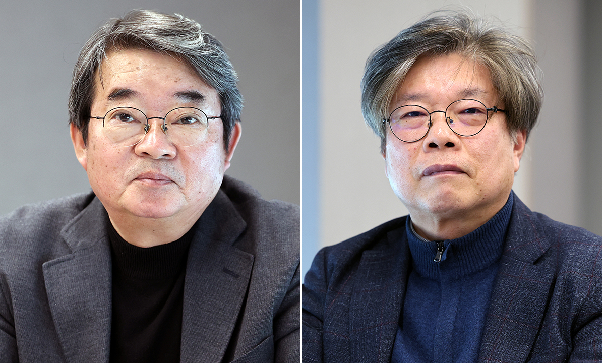 안도현(왼쪽), 유성호. ‘크린토피아’는 전문 서비스점에서 세탁기를 돌리는 화자와 먼 옛날 붉은 실뭉치로 지도를 짜던 할머니를 대칭적으로 구성하여 오랜 시간을 사이에 둔 삶의 페이소스를 자아낸 명품이다. 일상을 살아가는 이의 내면적 고통과 그로 인한 실존적 반응의 연쇄를 소환하면서, 삶에 대한 예민한 관찰과 묘사를 통해 인간 실존의 난경(難境)들을 은유해 가는 시인의 필치가 예사롭지 않았다. 낮은 목소리에 얹힌 비명과 울음의 총량이 할머니의 삶으로 이어지면서, 비록 열리지 않지만 지도처럼 다시 돋아나는 삶의 역설적 희망을 건네주고 있다. 탈수가 끝난 세탁기 안에서 할머니의 구겨진 몸을 펴는 화자의 마음이 붉은 혈관처럼 감동으로 나직하게 전해진다. 응모된 다른 작품들도 균질성과 지속성을 예감시키는 수준작이라고 심사위원들은 판단하였다. 그 점에서 당선자의 시편이 가지는 공감의 능력은 폭넓게 인정받을 수 있으리라 기대해 본다. 좋은 신인을 얻어 마음 깊이 반갑다.
