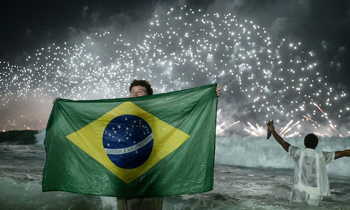 브라질 리우데자네이루 코파카바나 해변에서 열린 새해맞이 불꽃놀이 행사에서 한 남성이 국기를 들고 즐거워하고 있다. 리우데자네이루=AFP연합뉴스 햇수로 5년째 전쟁을 이어가고 있는 러시아와 우크라이나 대통령도 각각 신년 메시지를 내놨다. 블라디미르 푸틴 러시아 대통령은 신년사에서 “우리의 영웅인 ‘특별군사작전’ 참가자들을 말과 행동으로 응원한다”고 말했다. 볼로디미르 젤렌스키 우크라이나 대통령은 “우리는 평화를 믿고 이를 위해 싸우고 또 노력할 것”이라고 강조했다.