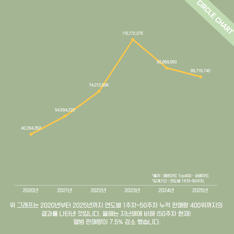 2025년 피지컬 앨범 누적 판매량 톱 15. 써클차트 제공 특히 피지컬 앨범 누적 판매량은 글로벌 그룹 방탄소년단(BTS)가 마지막으로 단체 활동을 했던 2023년에 정점(1억1517만2375장)을 찍은 이후 계속 줄고 있다. 같은 기간 누적 앨범 판매량이 100만장 이상인 가수는 23팀으로 전년 동기(24팀) 대비 1팀 감소했다.