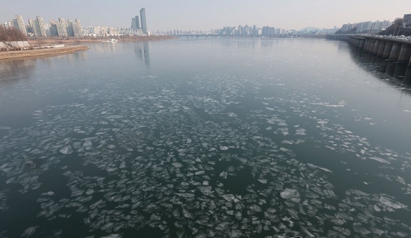 한강. 연합뉴스 자료사진 한강은 과거에 견줘 늦고 짧게 어는 경향이 있다. 1980년대 한강종합개발사업으로 수심이 깊어지고 직선화되면서 유속이 빨라진 점과 기후변화로 기온이 오른 점이 이유로 분석된다. 기상청은 당분간 찬 공기의 영향으로 추운 날씨가 이어질 것으로 내다봤다.