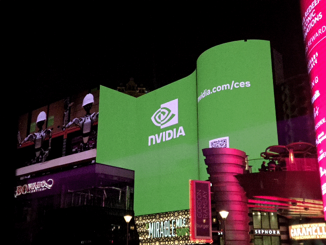 엔비디아 옥외광고판 gif. ◆다시 CES 찾은 젠슨 황 한편 AI 시대 ‘황제’로 떠오른 엔비디아는 라스베이거스 가장 중심에서 젠슨 황 최고경영자(CEO)의 ‘CES 행보’를 선전하고 나섰다. 황 CEO는 5일 특별 연설, 6일 기자간담회 등을 열며 라스베이거스를 종횡무진 누빌 예정이다.