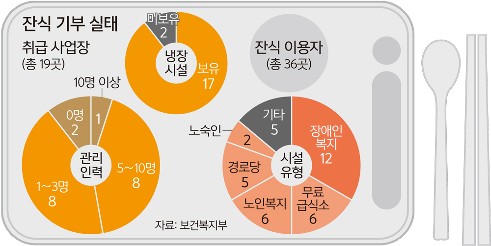전국 푸드뱅크 19곳 중 10명 이상 관리 인력이 있었던 곳은 1곳뿐이었고, 아예 없는 경우도 2곳이다. 냉장 차량이나 냉장 시설이 없는 곳도 2곳이었다. 음식이 조리된 상태로 이동하기 때문에 온·습도 유지가 중요한데도 관리가 제대로 이뤄지지 않는다는 지적이다. 복지부는 “잔식을 기부받는 시설에서 직접 수령하기로 한 사업장”이라고 설명했다.