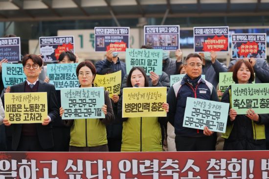 아울러 "병원은 노동조합과 노동자들을 존중하고 단체협약을 이행하라"라며 "병원은 일방적인 인력축소 철회하고 근무자 수 합의 준수해야 한다"고 덧붙였다.