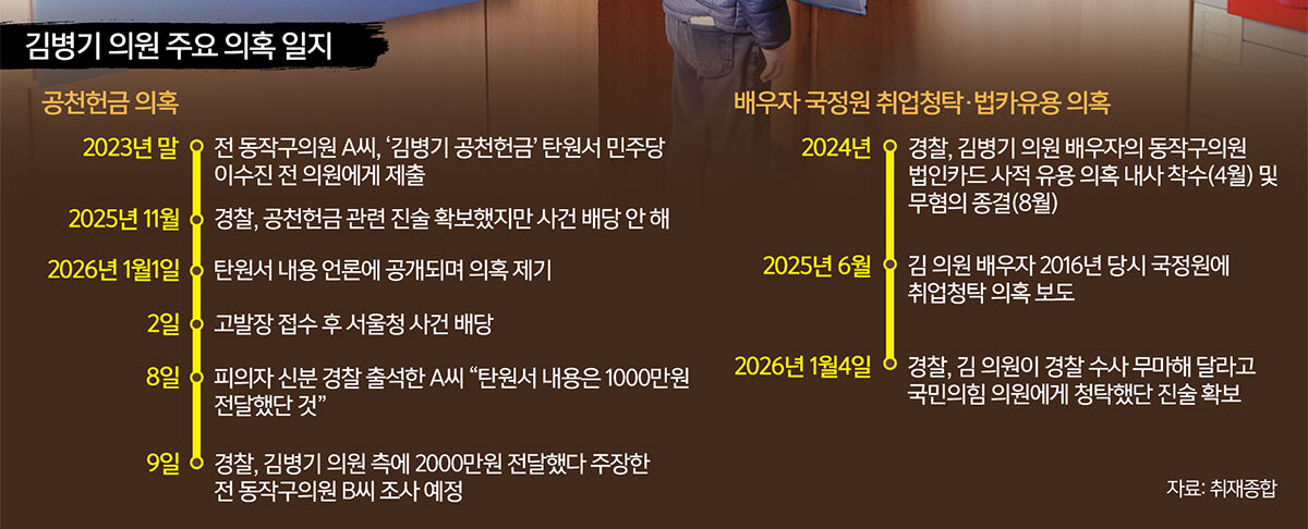 이 중에서도 김 의원이 2020년 총선을 앞두고 전직 동작구의원들로부터 공천헌금을 받았다는 의혹과 무소속 강선우 의원이 김경 서울시의원으로부터 1억원을 받은 것을 김 의원이 알고 도와줬다는 의혹이 핵심으로 꼽힌다.