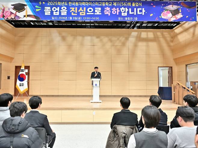 이세용 한울원자력본부장이 한국원자력마이스터고 졸업식에서 축사를 하고 있다. 한울본부는 앞으로도 지역 학생들을 대상으로 장학사업과 교육 지원을 지속적으로 확대해 지역사회와 상생하는 인재 육성에 힘쓸 방침이다. 이세용 한울본부장은 "학생들이 스스로의 가능성을 믿고 각자의 미래를 주체적으로 개척해 나가길 바라며 앞으로도 한울본부는 인재들을 위한 든든한 디딤돌이 되겠다"고 강조했다.