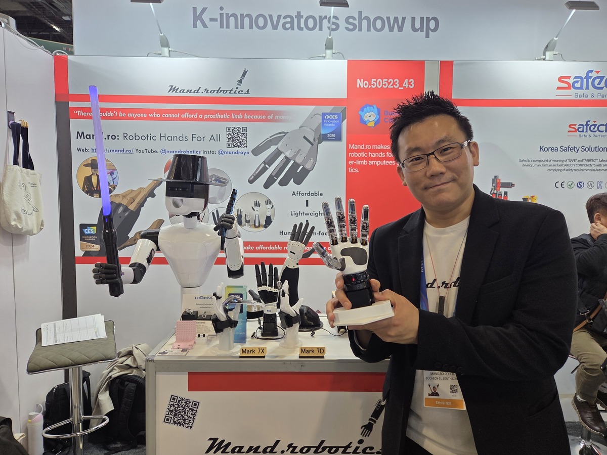만드로 이상호 대표가 지난 6일(현지시간) 세계 최대 전자·정보기술(IT) 박람회 ‘CES 2026’ 통합한국관 내 만드로 부스에서 이번 CES에서 혁신상을 수상한 ‘마크 7X’를 들고 포즈를 취하고 있다. 라스베이거스=이동수 기자 ◆500g 초경량, 사람 손 크기로도 ‘고성능’ 구현 오버소닉의 로비에 탑재될 마크 7은 사람 손과 유사한 크기와 형태를 유지하면서도 무게를 500g 미만으로 줄인 경량화 설계가 특징이다. 특히 손가락 마디 내부에 자체 개발한 초소형 액추에이터를 집적해 가벼우면서도 산업 현장에서 요구되는 강력한 파지력과 정밀한 제어 성능을 동시에 구현했다.