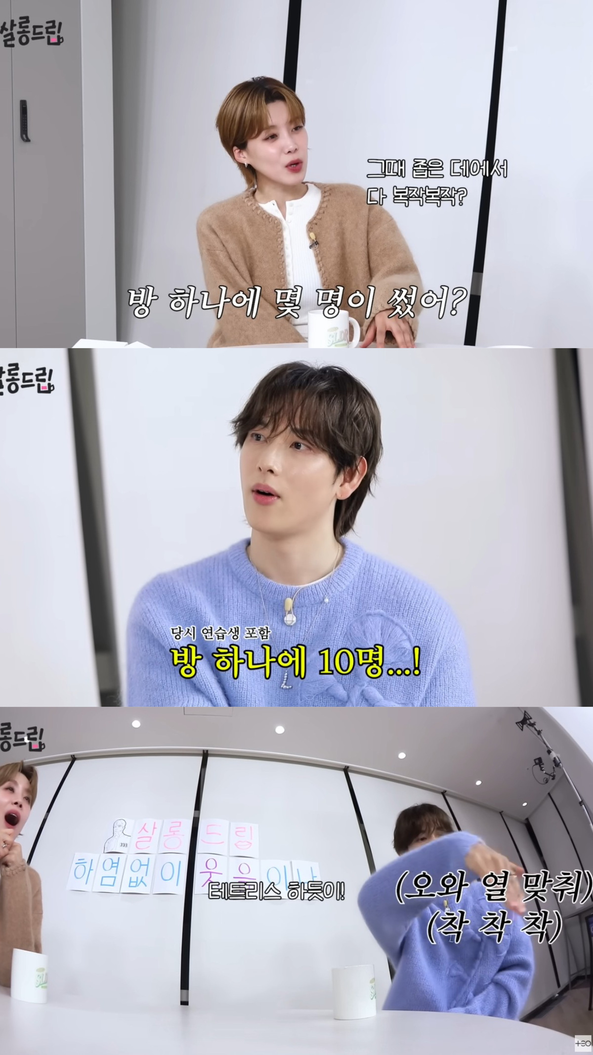 열악했던 당시 숙소. 유튜브 채널 'TEO 테오' 영상 캡처 임시완은 “제일 처음으로 거슬러 가면, 데뷔하지 못한 연습생을 포함해 방 하나에 연습생 10명씩 테트리스 하듯 겹쳐서 잤다”라고 말했다. 임시완은 당시의 열악했던 환경을 떠올리며 “10명이 빈틈없이 누워 있다 보니 늦게 귀가한 멤버는 자고 있는 다른 멤버를 본의 아니게 밟고 지나가야 했고, 밟힌 멤버는 ‘괜찮다, 자라’라며 서로를 다독이며 생활했다”라고 말했다.