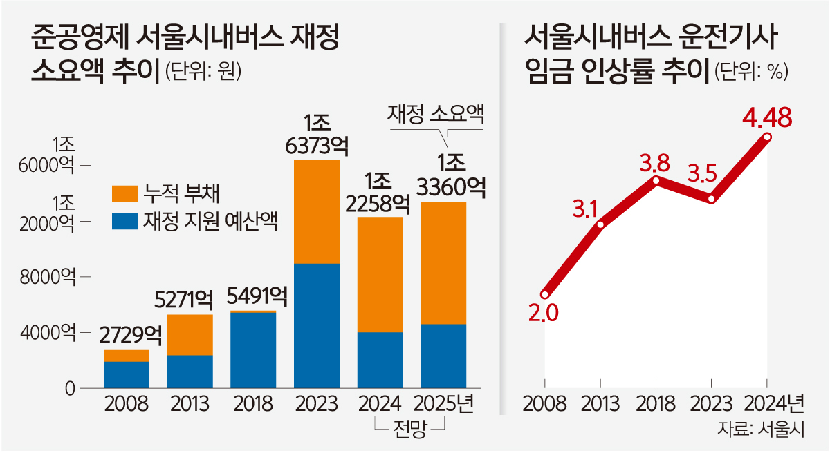 시는 버스 준공영제에 따라 매년 예산을 편성해 업계에 재정을 지원하고 있다. 버스 준공영제는 민영제와 공영제를 섞은 형태다. 버스노선의 운영과 수입금은 업계가 관리하고, 적자가 발생하면 서울시가 이를 보전하는 구조다. 시내버스의 적자 규모가 커질수록 재정 지원액도 커질 수밖에 없다. 시는 업계에 코로나19 시기인 2022년, 2023년 각각 8114억원, 8915억원에 달하는 금액을 시 예산으로 지원했다. 2024년과 지난해는 각각 4000억원, 4575억원이 지원된 것으로 잠정 집계됐다.