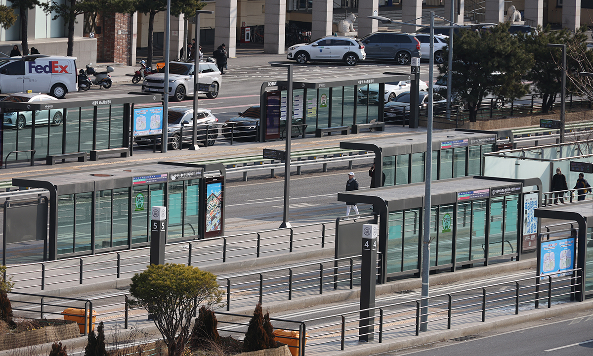 서울 시내버스 무기한 전면파업 이틀 차인 14일 서울역 버스환승센터 정류장이 텅 비어있다. 연합뉴스 서울시는 이날부터 강화된 비상수송대책을 운영해 파업에 대응하고 있다. 출퇴근 배차시간은 평시 대비 2시간 연장하고, 이를 통해 172회였던 지하철 증회를 203회로 확대했다. 혼잡도가 높은 역사에는 빈차를 투입하는 등 탄력적으로 지하철을 운영하기로 했다. 지하철역 연계를 위한 전세버스는 전날보다 86대를 추가해 일 763대를 운영 중이다. 관내 가로변버스전용차로 전 구간에는 일반차량의 통행도 허용했다.