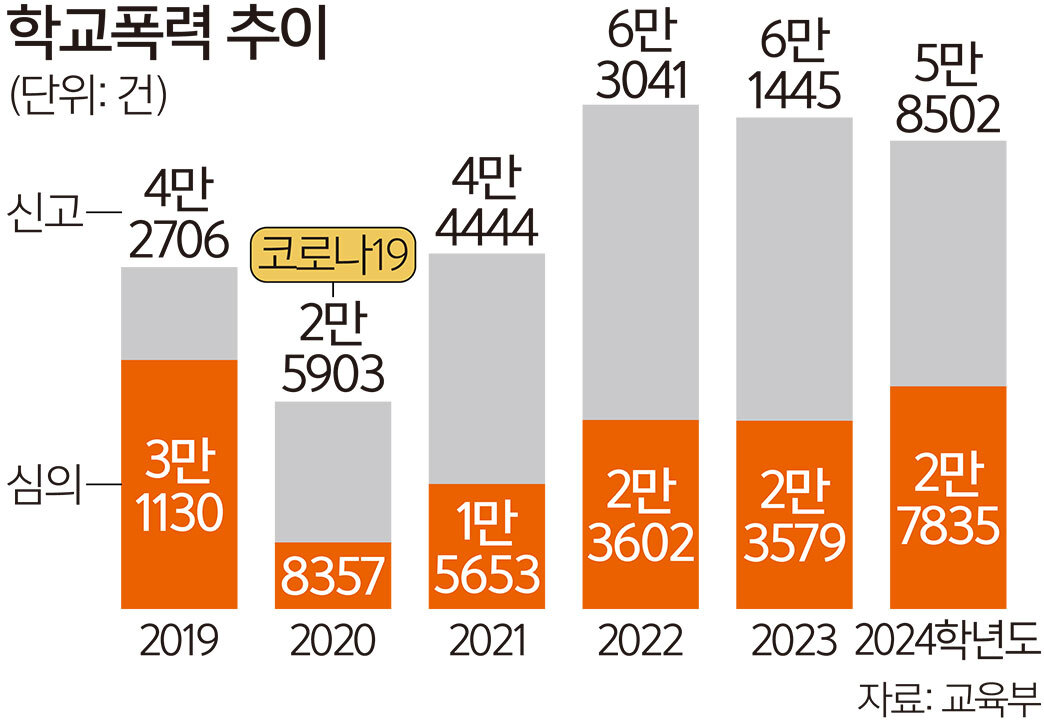 14일 교육부에 따르면 2024학년도에 전국에서 접수된 학교폭력은 5만8502건으로 전년도(6만1445건)보다 줄었지만, 학교에서 해결되지 않아 학폭위에 넘어간 사안은 2만3579건에서 2만7835건으로 오히려 늘었다.