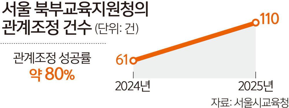 현장 반응은 좋다. 북부교육지원청 지원단은 2024년 61건, 지난해 110건의 조정을 진행했으며, 약 80%의 조정에 성공했다. 초등학교에서 학급 단위 관계회복 수업을 진행해 지난해 관내 초등학교의 학교폭력 접수가 30% 이상 줄기도 했다. 북부교육지원청 관계자는 “학교가 갈등을 중재하려 하면 ‘상대방 편을 든다’, ‘사안을 덮으려 한다’는 오해를 할 수 있지만, 교육지원청에서 진행하니 학부모 신뢰가 높고, 학교도 부담을 덜 수 있다”고 설명했다. 서울시교육청의 조사 결과 학생·학부모의 만족도는 97%에 달했다.