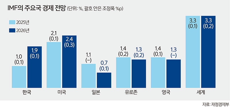 국제통화기금(IMF)이 올해 한국의 경제성장률을 1.9%로 전망했다. 종전 전망치보다 0.1%포인트 올라갔지만, 정부가 제시한 올해 성장률 목표치인 2.0%에는 미치지 못했다. 올해 세계경제 성장률은 종전보다 0.2%포인트 올린 3.3%로 전망했지만, 무역 불확실성과 지정학적 긴장 등에 따른 하방요인이 클 것으로 봤다. 특히 인공지능(AI)의 생산성과 수익성이 기대에 미치지 못할 경우 금융리스크로 이어질 수 있다고 경고했다.