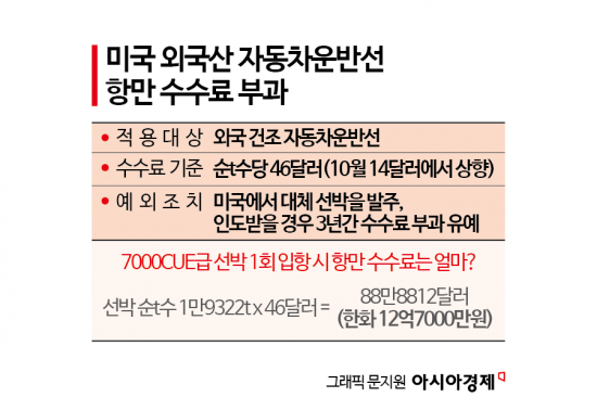 미국이 외국산 자동차 운반선에 입항 수수료를 부과하면서 현대차뿐 아니라 현대차그룹 물류 계열사인 현대글로비스도 연간 2000억원의 비용 부담을 떠안게 생겼다.