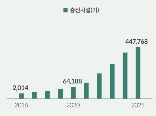 전기차 충전소는 2016년 2014기에서 올해 44만7768기(지난달 기준)로 지속해서 증가하고 있다. 2030년까지 매년 235~318기씩 늘어날 전망이다. 충전시설의 약 70%가 공동주택에 설치돼 있다.